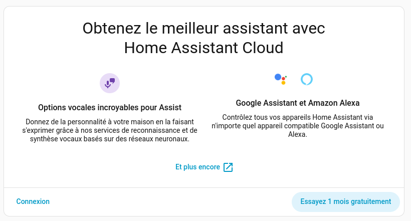 Je sais qu'il existe une méthode officielle pour profiter de la reconnaissance vocale par Google Assistant et Amazon Alexa mais elle nécessite un abonnement payant au service Home Assistant Cloud mais elle présente pour moi deux problèmes :